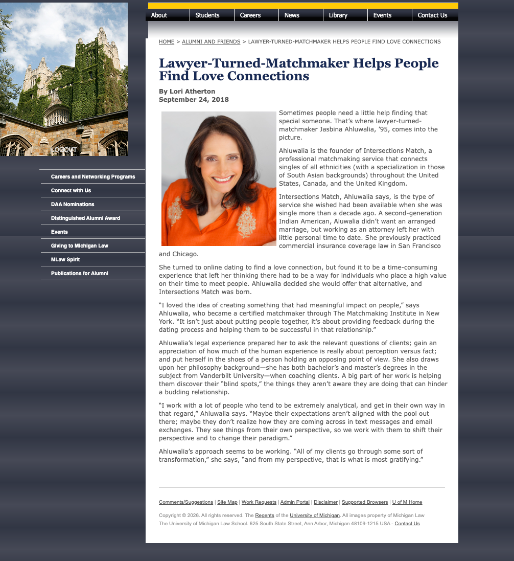 Intersections Match, Ahluwalia says, is the type of service she wished had been available when she was single more than a decade ago. A second-generation Indian American, Aluwalia didn’t want an arranged marriage, but working as an attorney left her with little personal time to date. She previously practiced commercial insurance coverage law in San Francisco and Chicago.